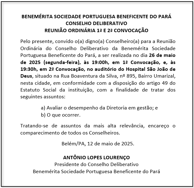 O Presidente do Conselho Deliberativo da Benemérita Sociedade Portuguesa Beneficente do Pará, Dr. Antônio Lopes Lourenço, convida os(as) dignos(as) Conselheiros(as) a comparecerem à Reunião Ordinária do Conselho Deliberativo, a realizar-se no dia 26 de maio de 2025 (segunda-feira), às 19:00h, em 1ª Convocação, e, às 19:30h, em 2ª Convocação, no auditório do Hospital São João de Deus, situado na Rua Boaventura da Silva, nº 895, Bairro Umarizal, nesta cidade, conforme a previsão do artigo 49 do Estatuto Social da instituição, com a finalidade de tratar dos seguintes assuntos: