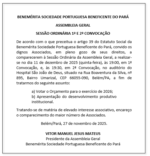 O Presidente da Assembleia Geral da Benemérita Sociedade Portuguesa Beneficente do Pará, Dr. Vitor Manuel Jesus Mateus, convida os dignos Associados a comparecerem à Sessão Ordinária da Assembleia Geral, a realizar-se no dia 11 de dezembro de 2025 (quinta-feira), às 19:00, em 1ª Convocação, e, às 19:30, em 2ª Convocação, no auditório do Hospital São João de Deus, situado na Rua Boaventura da Silva, nº 895, Bairro Umarizal, CEP 66055-090, Belém/PA, conforme as disposições previstas no artigo 39 do Estatuto Social da Instituição, com a finalidade de tratar do seguinte assunto: